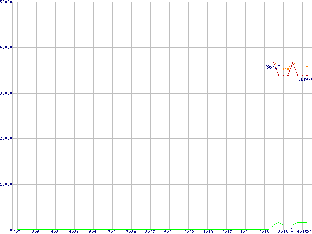 ※このグラフは過去のデータも税率5%相当に調整した税込み相当額のグラフです。 税率変更や、総額表示方式導入(2004年4月)の影響は除いています。 | | | ●凡例 | 最安値 (点線部は販売店未確認 または未調査) | 平均値 | 最高値 | ショップ数 |