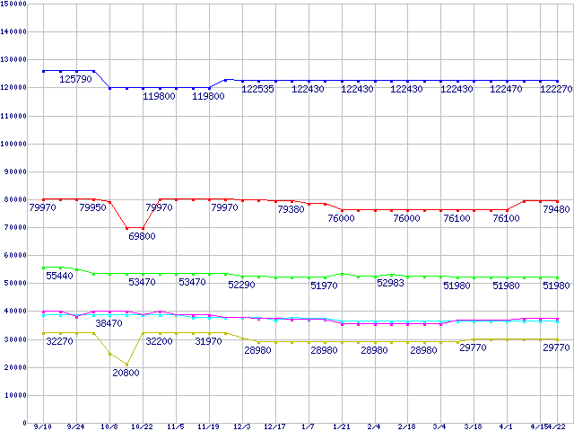 | Socket 604 (micro-PGA,FSB 533MHz,L2 512KB,Prestonia)の最安値推移 | | | (2004年9月10日~2005年4月22日) |