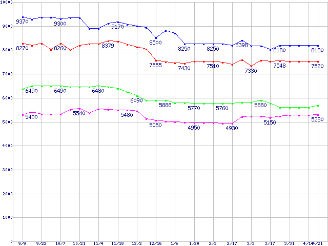 | Barracuda 7200.7 (7200rpm,Ultra ATA/100,2MB,80GB/Platter)の最安値推移 | | | (2004年9月9日~2005年4月21日) |