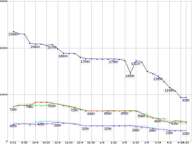 PC3200(DDR400) DDR SDRAM DIMMの最安値推移
