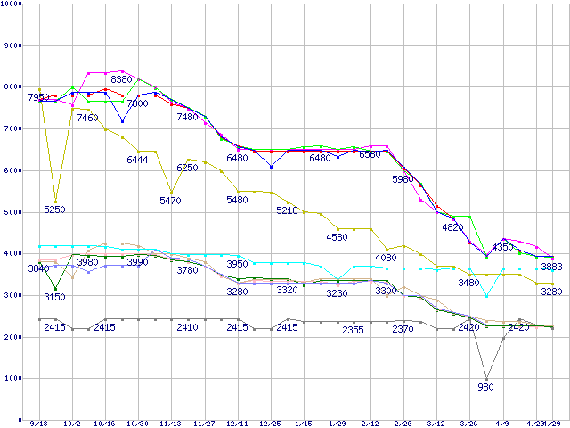 メモリ主要製品(最安値5千円~1万円未満)の最安値推移