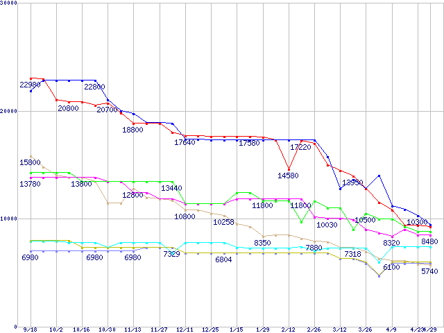 メモリ主要製品(最安値5千円~1万円未満)の最安値推移