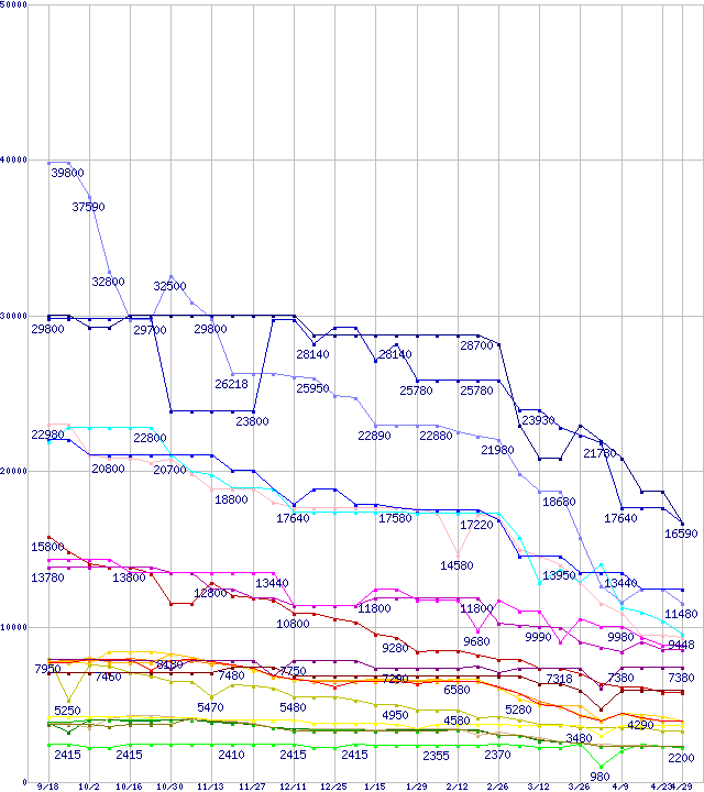 メモリ主要製品(最安値1万円以上)の最安値推移