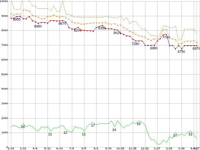 ※このグラフは過去のデータも税率5%相当に調整した税込み相当額のグラフです。 税率変更や、総額表示方式導入(2004年4月)の影響は除いています。 | | | ●凡例 | 最安値 (点線部は販売店未確認 または未調査) | 平均値 | 最高値 | ショップ数 |