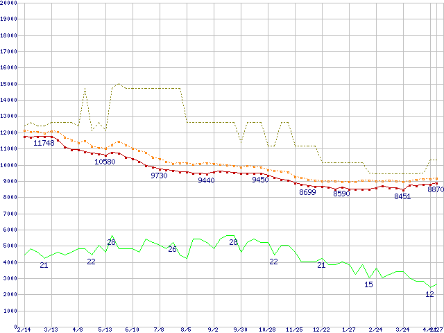 ※このグラフは過去のデータも税率5%相当に調整した税込み相当額のグラフです。 税率変更や、総額表示方式導入(2004年4月)の影響は除いています。 | | | ●凡例 | 最安値 (点線部は販売店未確認 または未調査) | 平均値 | 最高値 | ショップ数 |