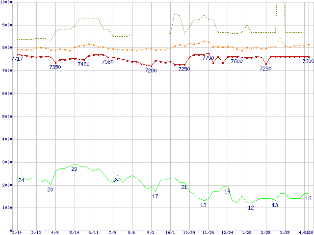 ※このグラフは過去のデータも税率5%相当に調整した税込み相当額のグラフです。 税率変更や、総額表示方式導入(2004年4月)の影響は除いています。 | | | ●凡例 | 最安値 (点線部は販売店未確認 または未調査) | 平均値 | 最高値 | ショップ数 |