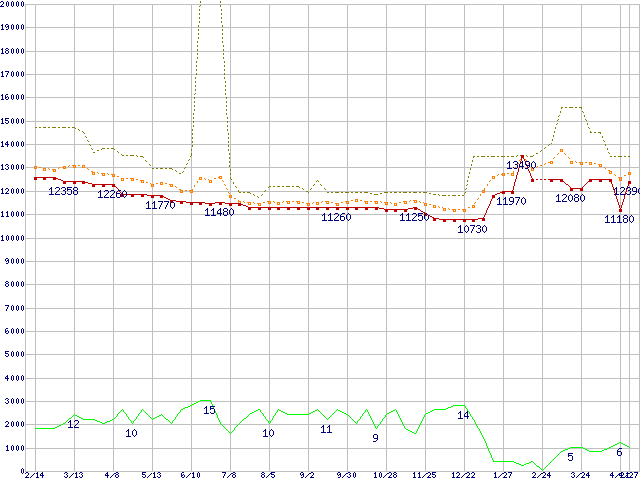 ※このグラフは過去のデータも税率5%相当に調整した税込み相当額のグラフです。 税率変更や、総額表示方式導入(2004年4月)の影響は除いています。 | | | ●凡例 | 最安値 (点線部は販売店未確認 または未調査) | 平均値 | 最高値 | ショップ数 |