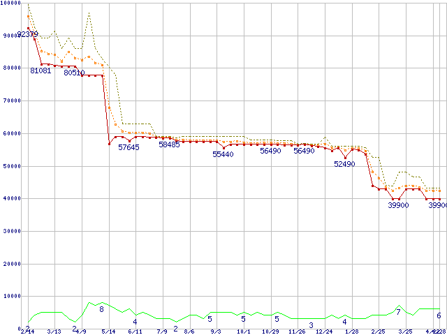 ※このグラフは過去のデータも税率5%相当に調整した税込み相当額のグラフです。 税率変更や、総額表示方式導入(2004年4月)の影響は除いています。 | | | ●凡例 | 最安値 (点線部は販売店未確認 または未調査) | 平均値 | 最高値 | ショップ数 |