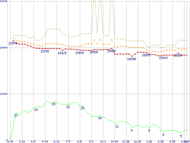 ※このグラフは過去のデータも税率5%相当に調整した税込み相当額のグラフです。 税率変更や、総額表示方式導入(2004年4月)の影響は除いています。 | | | ●凡例 | 最安値 (点線部は販売店未確認 または未調査) | 平均値 | 最高値 | ショップ数 |