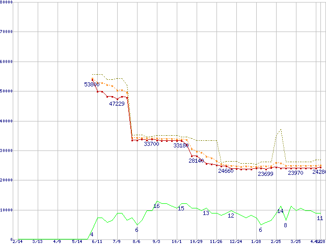 ※このグラフは過去のデータも税率5%相当に調整した税込み相当額のグラフです。 税率変更や、総額表示方式導入(2004年4月)の影響は除いています。 | | | ●凡例 | 最安値 (点線部は販売店未確認 または未調査) | 平均値 | 最高値 | ショップ数 |
