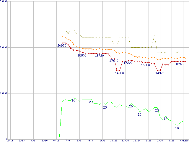 ※このグラフは過去のデータも税率5%相当に調整した税込み相当額のグラフです。 税率変更や、総額表示方式導入(2004年4月)の影響は除いています。 | | | ●凡例 | 最安値 (点線部は販売店未確認 または未調査) | 平均値 | 最高値 | ショップ数 |