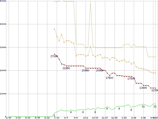 PC2 3200(DDR2 400) DDR2 SDRAM DIMM ECC対応 Registeredタイプの最安値推移