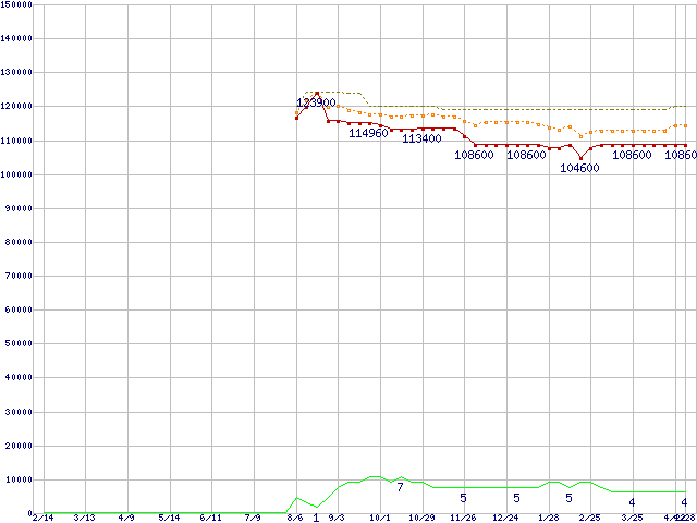 ※このグラフは過去のデータも税率5%相当に調整した税込み相当額のグラフです。 税率変更や、総額表示方式導入(2004年4月)の影響は除いています。 | | | ●凡例 | 最安値 (点線部は販売店未確認 または未調査) | 平均値 | 最高値 | ショップ数 |