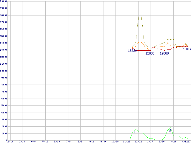 ※このグラフは過去のデータも税率5%相当に調整した税込み相当額のグラフです。 税率変更や、総額表示方式導入(2004年4月)の影響は除いています。 | | | ●凡例 | 最安値 (点線部は販売店未確認 または未調査) | 平均値 | 最高値 | ショップ数 |