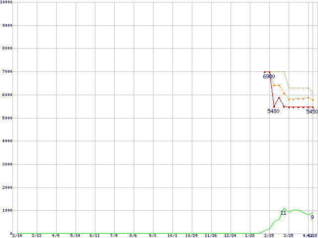 ※このグラフは過去のデータも税率5%相当に調整した税込み相当額のグラフです。 税率変更や、総額表示方式導入(2004年4月)の影響は除いています。 | | | ●凡例 | 最安値 (点線部は販売店未確認 または未調査) | 平均値 | 最高値 | ショップ数 |