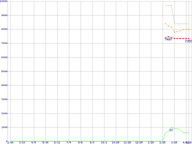 ※このグラフは過去のデータも税率5%相当に調整した税込み相当額のグラフです。 税率変更や、総額表示方式導入(2004年4月)の影響は除いています。 | | | ●凡例 | 最安値 (点線部は販売店未確認 または未調査) | 平均値 | 最高値 | ショップ数 |