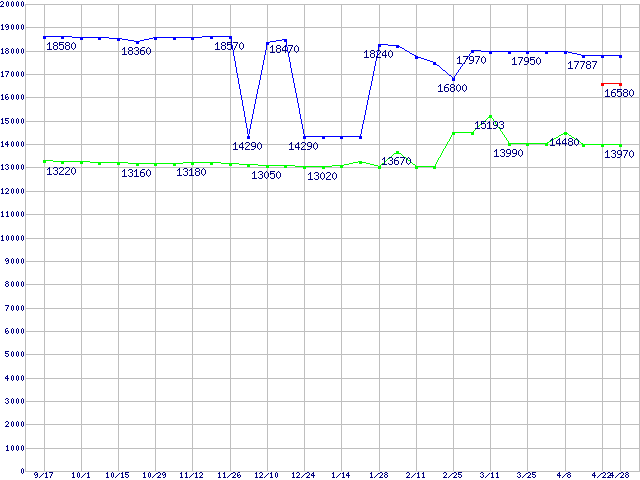 Socket 478 (FC-PGA2,FSB 800MHz,L2 512KB,Hyper-Threading,Northwood)の最安値推移