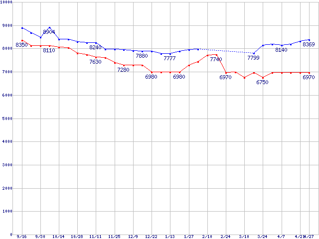 | DiamondMax 16 (5400rpm,Ultra ATA/133,2MB,80GB/Platter)の最安値推移 | | | (2004年9月16日~2005年4月27日) |