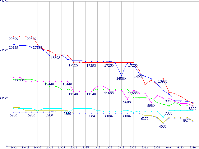 メモリ主要製品(最安値5千円~1万円未満)の最安値推移