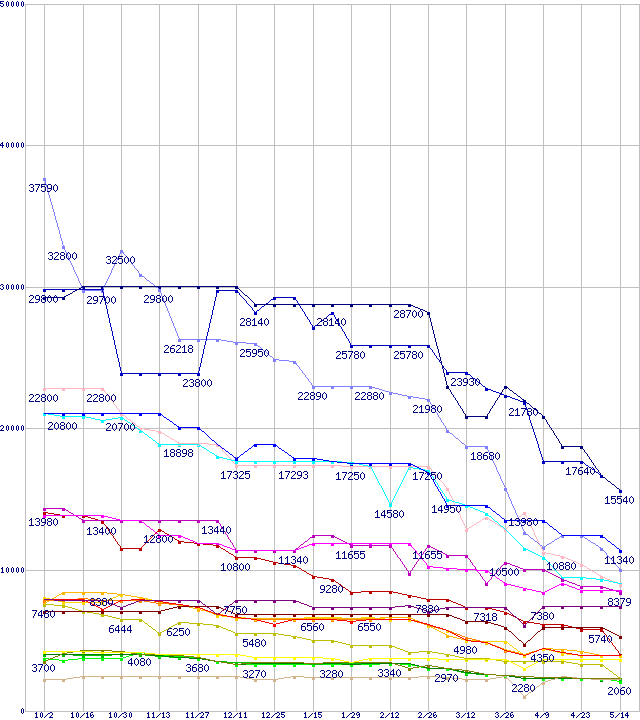 メモリ主要製品(最安値1万円以上)の最安値推移