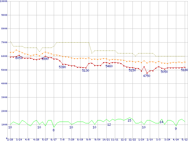 ※このグラフは過去のデータも税率5%相当に調整した税込み相当額のグラフです。 税率変更や、総額表示方式導入(2004年4月)の影響は除いています。 | | | ●凡例 | 最安値 (点線部は販売店未確認 または未調査) | 平均値 | 最高値 | ショップ数 |