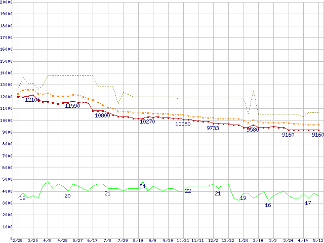 ※このグラフは過去のデータも税率5%相当に調整した税込み相当額のグラフです。 税率変更や、総額表示方式導入(2004年4月)の影響は除いています。 | | | ●凡例 | 最安値 (点線部は販売店未確認 または未調査) | 平均値 | 最高値 | ショップ数 |