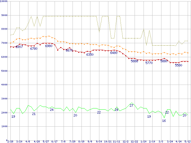 ※このグラフは過去のデータも税率5%相当に調整した税込み相当額のグラフです。 税率変更や、総額表示方式導入(2004年4月)の影響は除いています。 | | | ●凡例 | 最安値 (点線部は販売店未確認 または未調査) | 平均値 | 最高値 | ショップ数 |