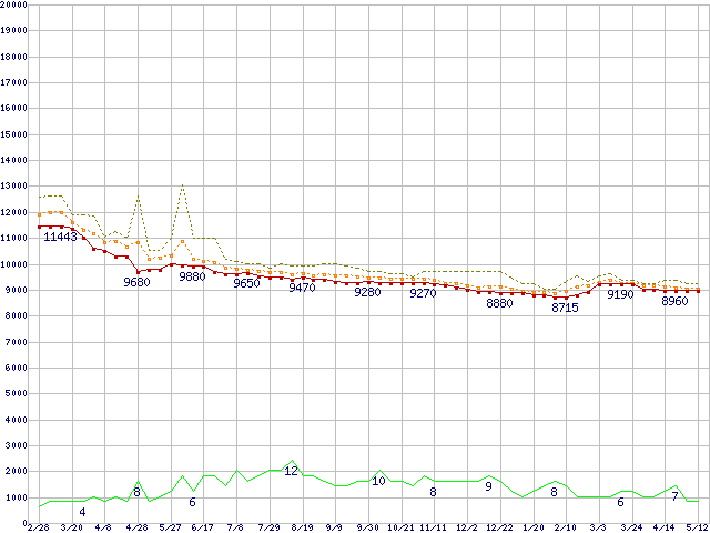 ※このグラフは過去のデータも税率5%相当に調整した税込み相当額のグラフです。 税率変更や、総額表示方式導入(2004年4月)の影響は除いています。 | | | ●凡例 | 最安値 (点線部は販売店未確認 または未調査) | 平均値 | 最高値 | ショップ数 |