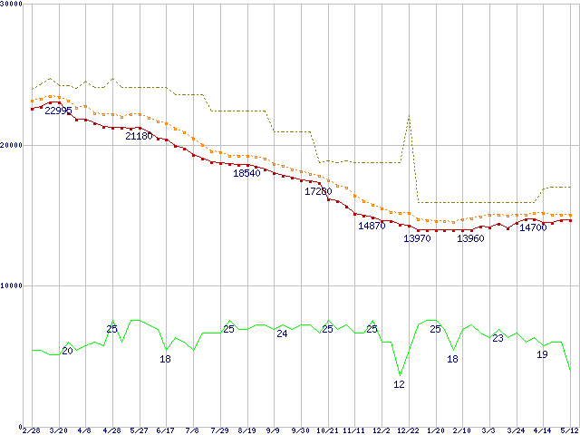 ※このグラフは過去のデータも税率5%相当に調整した税込み相当額のグラフです。 税率変更や、総額表示方式導入(2004年4月)の影響は除いています。 | | | ●凡例 | 最安値 (点線部は販売店未確認 または未調査) | 平均値 | 最高値 | ショップ数 |