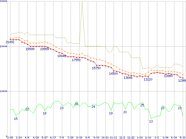 ※このグラフは過去のデータも税率5%相当に調整した税込み相当額のグラフです。 税率変更や、総額表示方式導入(2004年4月)の影響は除いています。 | | | ●凡例 | 最安値 (点線部は販売店未確認 または未調査) | 平均値 | 最高値 | ショップ数 |
