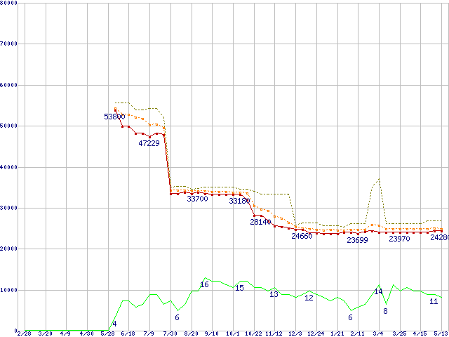 | Athlon 64 3400+(2.4GHz,L2 512KB) リテールパッケージの価格推移 | | | (2004年2月28日~2005年5月13日) |