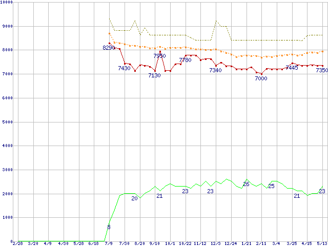 ※このグラフは過去のデータも税率5%相当に調整した税込み相当額のグラフです。 税率変更や、総額表示方式導入(2004年4月)の影響は除いています。 | | | ●凡例 | 最安値 (点線部は販売店未確認 または未調査) | 平均値 | 最高値 | ショップ数 |