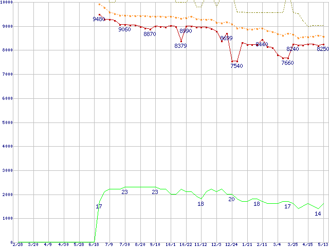 | Celeron D 325 (2.53GHz) リテールパッケージの価格推移 | | | (2004年2月28日~2005年5月13日) |