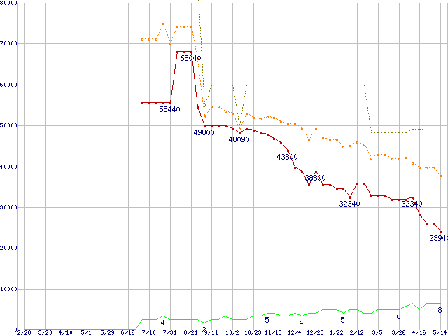 ※このグラフは過去のデータも税率5%相当に調整した税込み相当額のグラフです。 税率変更や、総額表示方式導入(2004年4月)の影響は除いています。 | | | ●凡例 | 最安値 (点線部は販売店未確認 または未調査) | 平均値 | 最高値 | ショップ数 |