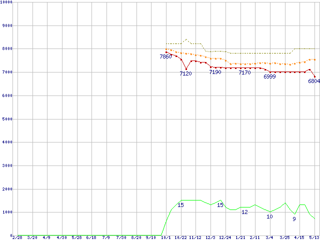 ※このグラフは過去のデータも税率5%相当に調整した税込み相当額のグラフです。 税率変更や、総額表示方式導入(2004年4月)の影響は除いています。 | | | ●凡例 | 最安値 (点線部は販売店未確認 または未調査) | 平均値 | 最高値 | ショップ数 |