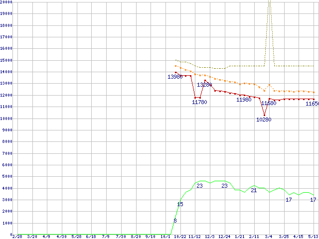 ※このグラフは過去のデータも税率5%相当に調整した税込み相当額のグラフです。 税率変更や、総額表示方式導入(2004年4月)の影響は除いています。 | | | ●凡例 | 最安値 (点線部は販売店未確認 または未調査) | 平均値 | 最高値 | ショップ数 |