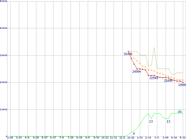 ※このグラフは過去のデータも税率5%相当に調整した税込み相当額のグラフです。 税率変更や、総額表示方式導入(2004年4月)の影響は除いています。 | | | ●凡例 | 最安値 (点線部は販売店未確認 または未調査) | 平均値 | 最高値 | ショップ数 |