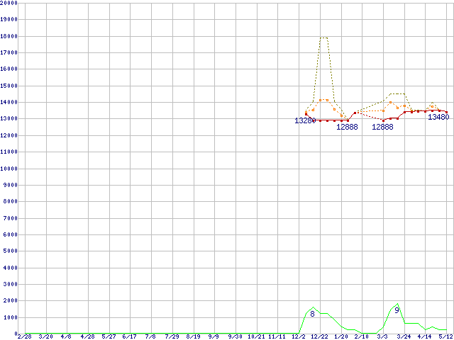 ※このグラフは過去のデータも税率5%相当に調整した税込み相当額のグラフです。 税率変更や、総額表示方式導入(2004年4月)の影響は除いています。 | | | ●凡例 | 最安値 (点線部は販売店未確認 または未調査) | 平均値 | 最高値 | ショップ数 |