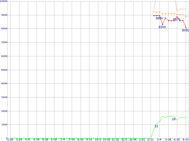 ※このグラフは過去のデータも税率5%相当に調整した税込み相当額のグラフです。 税率変更や、総額表示方式導入(2004年4月)の影響は除いています。 | | | ●凡例 | 最安値 (点線部は販売店未確認 または未調査) | 平均値 | 最高値 | ショップ数 |
