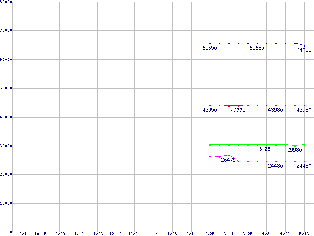 | LGA 775 (FC-LGA4 ,FSB 800MHz,L2 2MB,Hyper-Threading,Prescott,EM64T・EIST・NX bit対応)の最安値推移 | | | (2004年10月1日~2005年5月13日) |