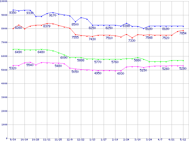 | Barracuda 7200.7 (7200rpm,Ultra ATA/100,2MB,80GB/Platter)の最安値推移 | | | (2004年9月30日~2005年5月12日) |
