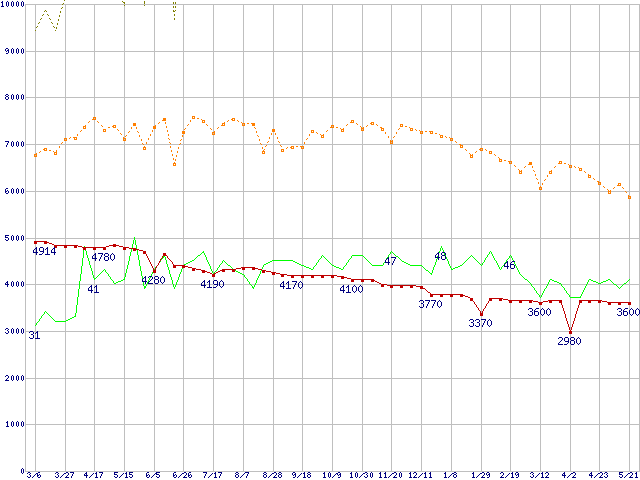 ※このグラフは過去のデータも税率5%相当に調整した税込み相当額のグラフです。 税率変更や、総額表示方式導入(2004年4月)の影響は除いています。 | | | ●凡例 | 最安値 (点線部は販売店未確認 または未調査) | 平均値 | 最高値 | ショップ数 |