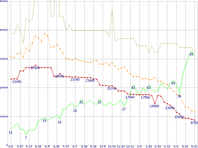 ※このグラフは過去のデータも税率5%相当に調整した税込み相当額のグラフです。 税率変更や、総額表示方式導入(2004年4月)の影響は除いています。 | | | ●凡例 | 最安値 (点線部は販売店未確認 または未調査) | 平均値 | 最高値 | ショップ数 |