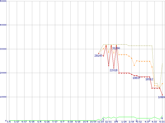 ※このグラフは過去のデータも税率5%相当に調整した税込み相当額のグラフです。 税率変更や、総額表示方式導入(2004年4月)の影響は除いています。 | | | ●凡例 | 最安値 (点線部は販売店未確認 または未調査) | 平均値 | 最高値 | ショップ数 |