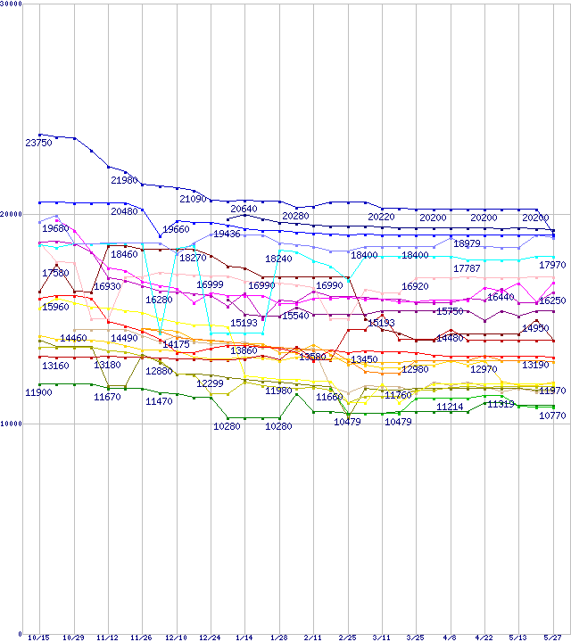 | CPU主要製品(最安値1万円~2万円未満)の最安値推移 | | | (2004年10月15日~2005年5月27日) |