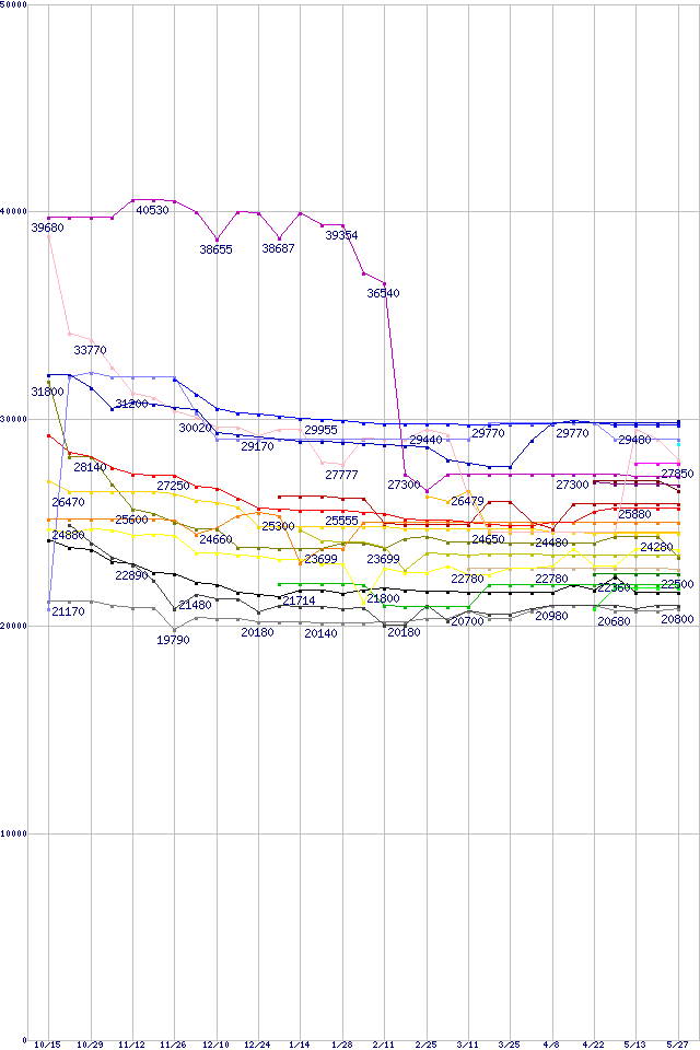 | CPU主要製品(最安値2万円~3万円未満)の最安値推移 | | | (2004年10月15日~2005年5月27日) |