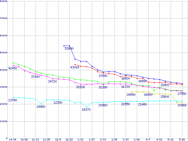HDD主要製品(最安値1万5千円~2万円未満)の最安値推移