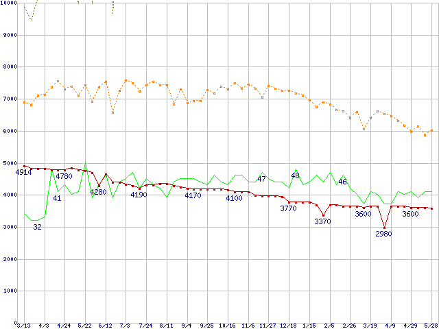 ※このグラフは過去のデータも税率5%相当に調整した税込み相当額のグラフです。 税率変更や、総額表示方式導入(2004年4月)の影響は除いています。 | | | ●凡例 | 最安値 (点線部は販売店未確認 または未調査) | 平均値 | 最高値 | ショップ数 |