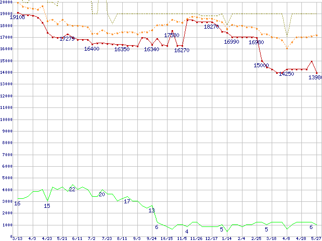 ※このグラフは過去のデータも税率5%相当に調整した税込み相当額のグラフです。 税率変更や、総額表示方式導入(2004年4月)の影響は除いています。 | | | ●凡例 | 最安値 (点線部は販売店未確認 または未調査) | 平均値 | 最高値 | ショップ数 |
