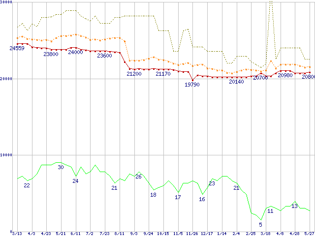 ※このグラフは過去のデータも税率5%相当に調整した税込み相当額のグラフです。 税率変更や、総額表示方式導入(2004年4月)の影響は除いています。 | | | ●凡例 | 最安値 (点線部は販売店未確認 または未調査) | 平均値 | 最高値 | ショップ数 |